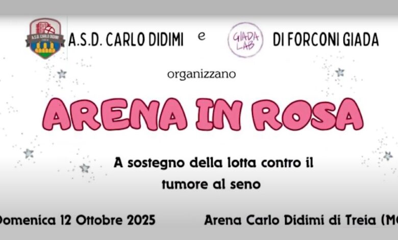 Domenica 12 ottobre Treia si tingerà di rosa. L’Arena Carlo Didimi , celebre per la Disfida del Bracciale, ospiterà “Arena in Rosa”, un’intera giornata dedicata al benessere, allo sport e alla solidarietà, organizzata dall’A.S.D. Carlo Didimi e da GiadaLab di Giada Forconi. L’iniziativa, patrocinata dal Comune di Treia, nasce per promuovere la prevenzione e raccogliere […]