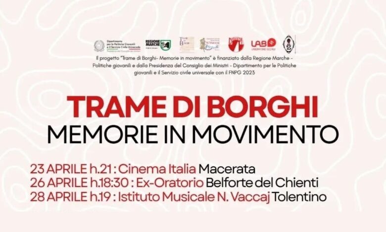 Da giovedì 23 a martedì 28 aprile “Trame di Borghi – Memorie in Movimento” presenterà i suoi eventi conclusivi a Macerata, Belforte del Chienti e Tolentino. Sono le fasi finali del progetto “Trame di Borghi – Memorie in Movimento”, realizzato grazie alla sinergia di quattro realtà associative, tramite percorsi artistici innovativi in cui giovani tra i […]