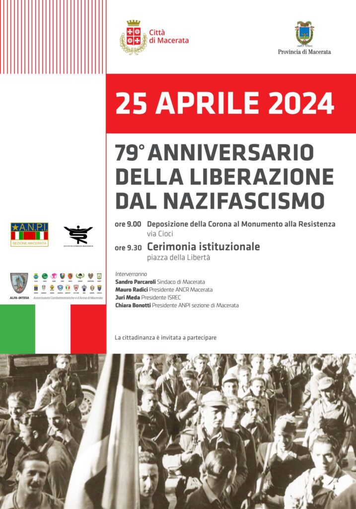 Saranno presenti il sindaco e presidente della Provincia Sandro Parcaroli, il presidente dell’ANCR Macerata Mauro Radici, il presidente ISREC Juri Meda e la presidente ANPI Macerata Chiara Bonotti.