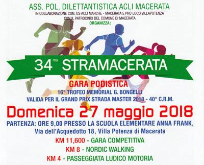 A Villa Potenza domenica 27 maggio si correrà la Stramacerata, gara podistica non competitiva organizzata dall’associazione polisportiva dilettantistica Acli Macerata in collaborazione con Us Acli Marche e Pro Loco Villa Potenza, con il patrocinio del Comune di Macerata.