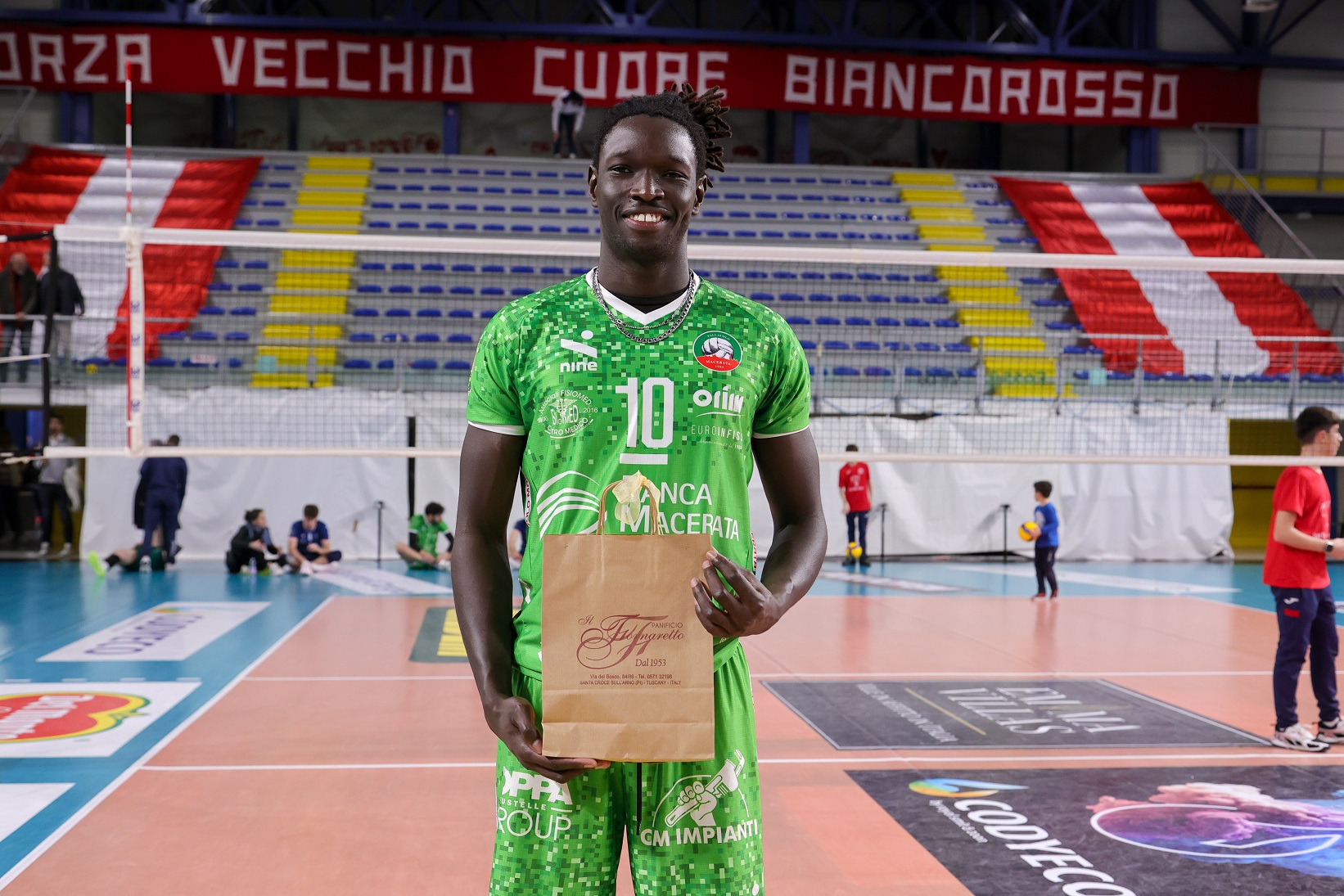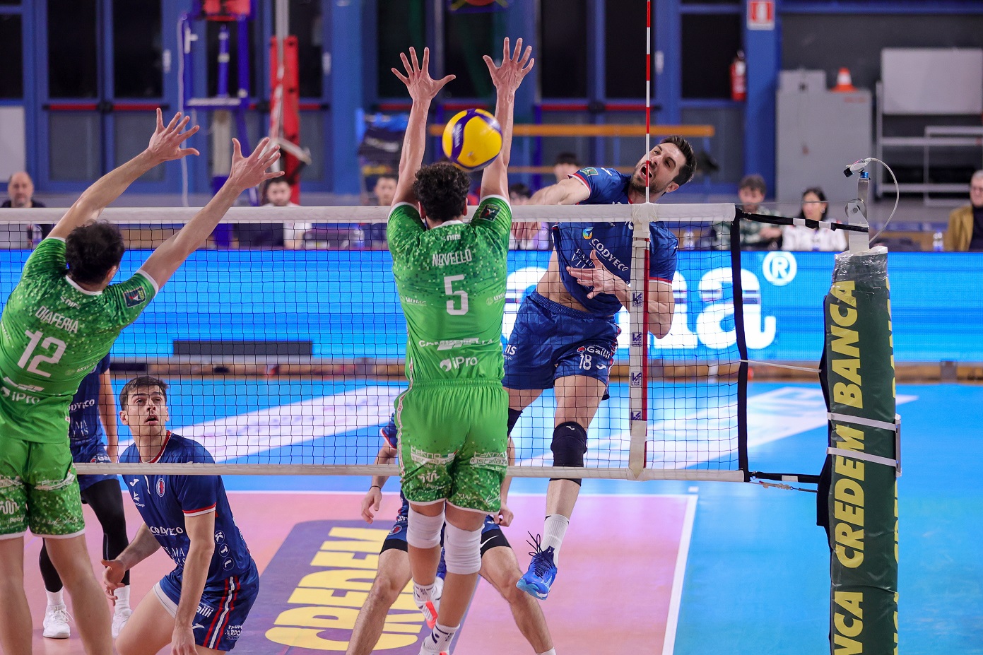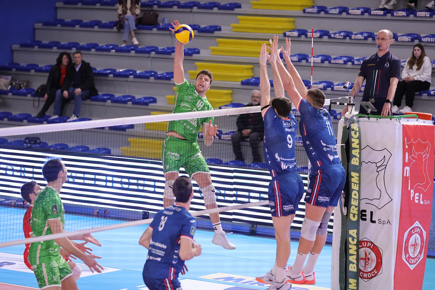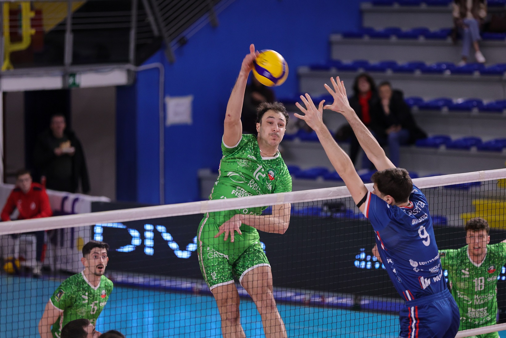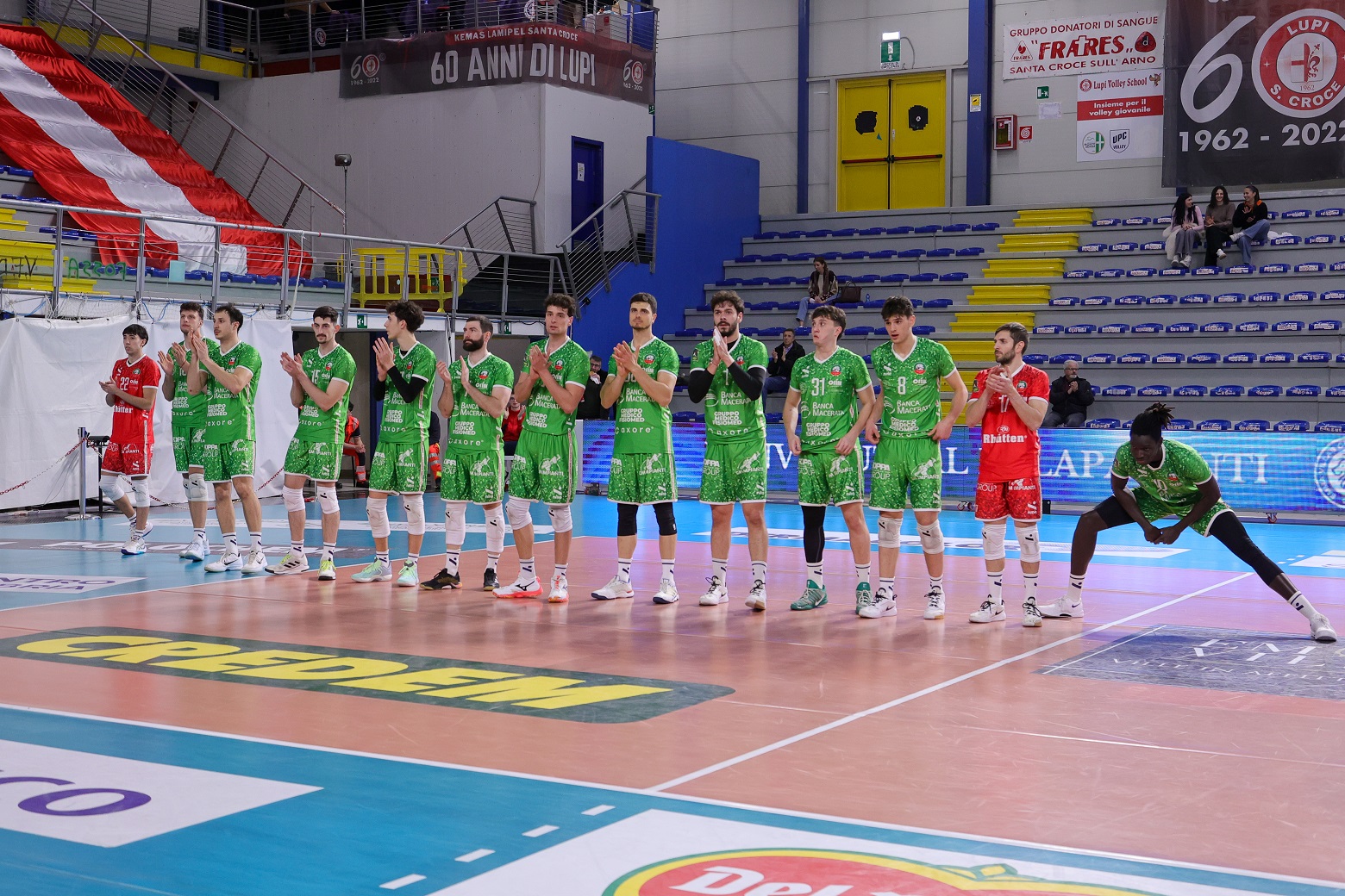 Banca Macerata Fisiomed, di verde come al solito in trasferta, schiera Pedron-Novello in diagonale principale, Karyagin-Zhelev come laterali, capitan Fall e Diaferia al centro, solita staffetta Gabbanelli-Dolcini in seconda linea.