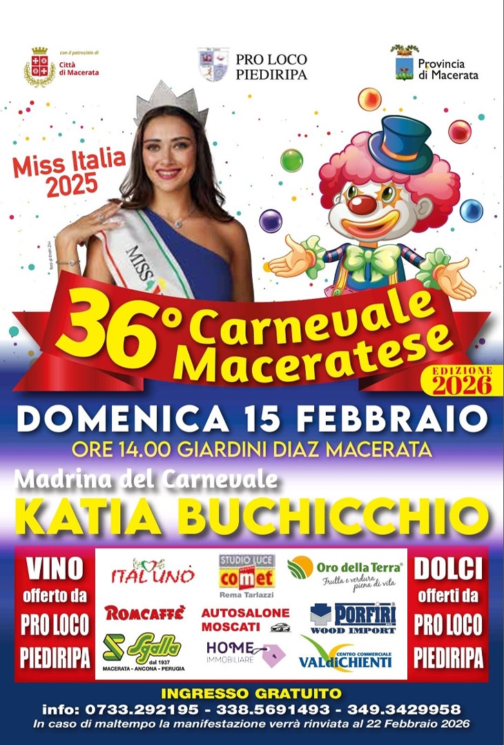 “Il Carnevale Maceratese è ormai una manifestazione consolidata della nostra città, capace di richiamare visitatori da tutto il territorio e di valorizzare al tempo stesso creatività, convivialità e tradizione – sottolinea l’assessore comunale ai Grandi Eventi Riccardo Sacchi –. Non si tratta solo di un’occasione di divertimento e di svago, ma di un appuntamento che contribuisce a promuovere l’immagine di Macerata e a rafforzarne l’attrattività. A questo si aggiunge il Carnevale per Bambini, fortemente voluto dalla nostra Amministrazione, che rappresenta uno spazio pensato appositamente per i più piccoli, che potranno dare libero sfogo alla fantasia, indossare i loro costumi preferiti e vivere la magia del Carnevale insieme alle famiglie. Grazie al prezioso lavoro della Pro Loco di Piediripa e della Pro Loco di Macerata, che ringrazio per la collaborazione e per la passione, questi eventi offrono un’opportunità concreta per riscoprire il piacere di stare insieme, socializzare e condividere momenti di festa e spensieratezza”.