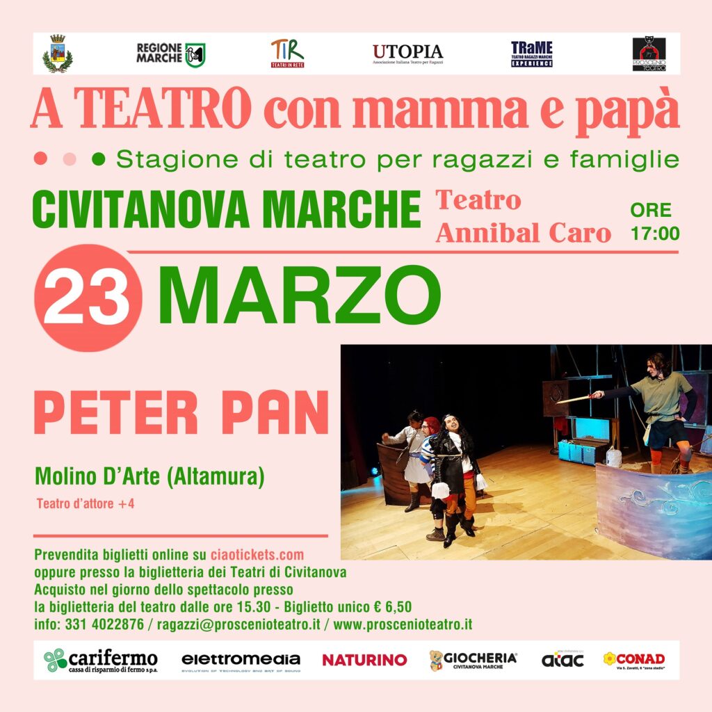 Info: biglietti online su ciaotickets (www.ciaotickets.com/it/biglietti/peter-pan-2) e punti vendita autorizzati Ciaotickets (Tabaccheria Frenquelli e Ricevitoria Lucky Point); biglietteria del Teatro Annibal Caro nel giorno dello spettacolo; prenotazioni tel. 331 4022876.