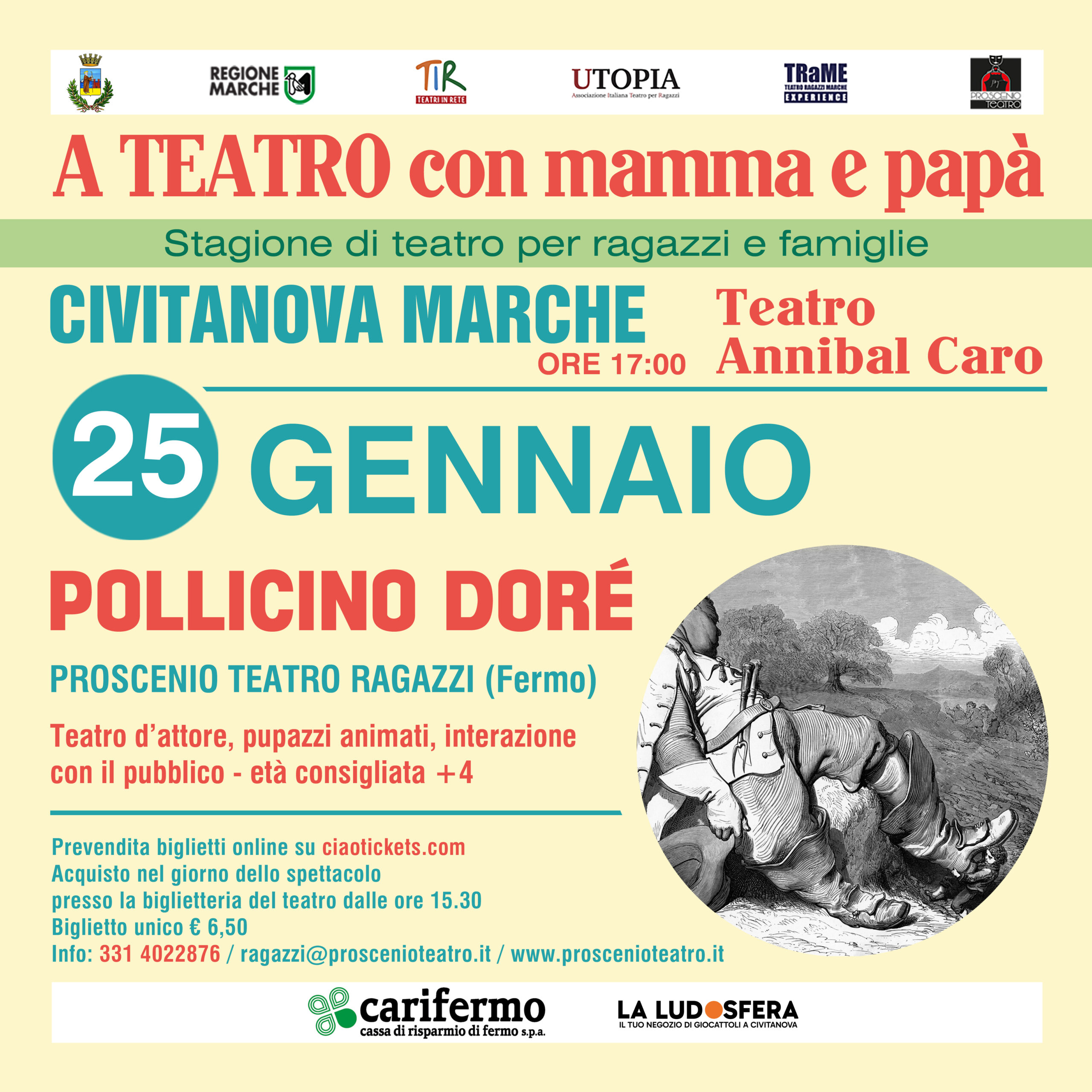 Domenica 25 gennaio, ore 17 al Teatro Annibal Caro di Civitanova Alta, va in scena il terzo appuntamento della rassegna per famiglie “A teatro con mamma e papà”.