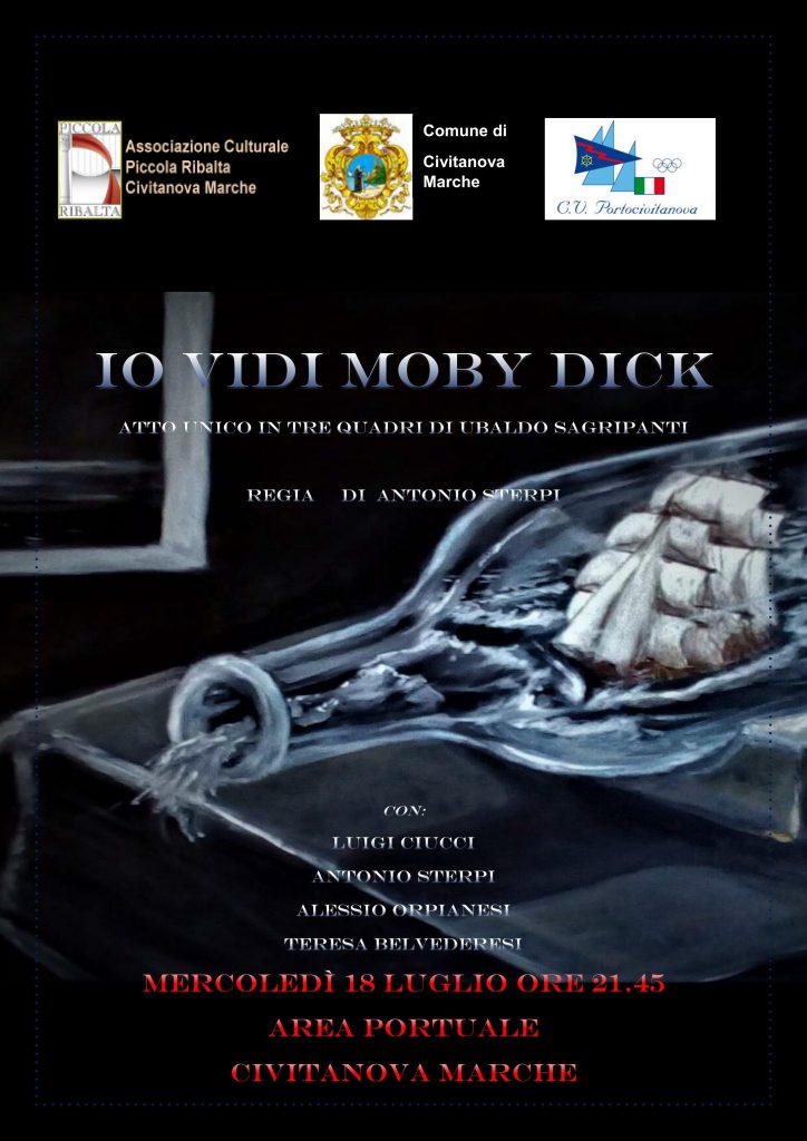 Mercoledì 18 luglio a Civitanova Marche, ore 21.45 nell’area portuale, la Compagnia Piccola Ribalta metterà in scena “Io vidi Moby Dick”, atto unico in tre quadri scritto da Ubaldo Sagripanti, con la regia di Antonio Sterpi.