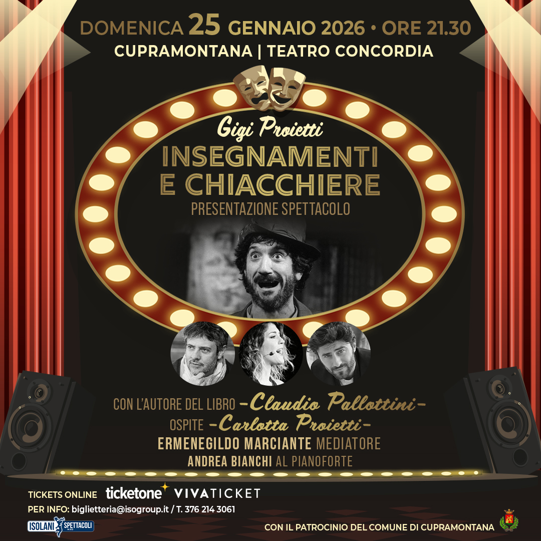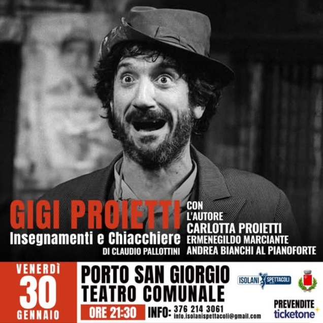 Domenica 25 gennaio al Teatro Concordia di Cupramontana e venerdi 30 al Teatro Comunale di Porto San Giorgio andrà in scena “Gigi Proietti: insegnamenti e chiacchiere”.