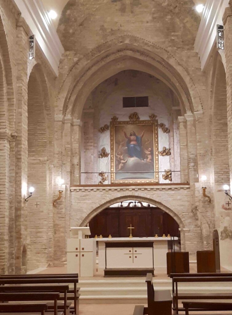 Situata nel quartiere di Castelnuovo, la chiesa di Santa Maria de Racanati è la più antica della città. Il suo nome compare in alcuni documenti farfensi a partire dall’anno 817. Nel 1253 la chiesa subì una vera riedificazione che cancellò le purissime forme gotiche trasformandole nelle attuali forme romaniche. Dell’antica chiesa sono rimasti i rosoni laterali e il bassorilievo sopra la porta principale, realizzato nel 1253 dal maestro Nicola anconitano su commissione del priore don Caro. L’interno originario è andato completamente cancellato dai lavori del 1840, anche se recenti restauri hanno riportato alla luce frammenti di antichi affreschi di Pietro da Recanati, risalenti all’inizio del XV secolo. La croce cerchiata in pietra, attualmente sopra il fonte battesimale, era nel rosone centrale. L’affresco raffigurante la Madonna con Bambino è attribuito a Pietro di Domenico da Montepulciano. Fra i dipinti che l’abbellivano erano anche La Trasfigurazione di Lorenzo Lotto, ora nella Pinacoteca di Villa Colloredo Mels, e il Polittico di Guglielmo Veneziano, ora al Museo Diocesano. L’edificio religioso, di proprietà della Diocesi, chiuso dal 2016 a causa del sisma, è stato sottoposto di recente a lavori di miglioramento sismico e messa in sicurezza degli apparati decorativi. L’apertura di questo bene nelle Giornate d’Autunno 2021 si inserisce nel completamento dei lavori di restauro e la riconsegna del bene alla città.