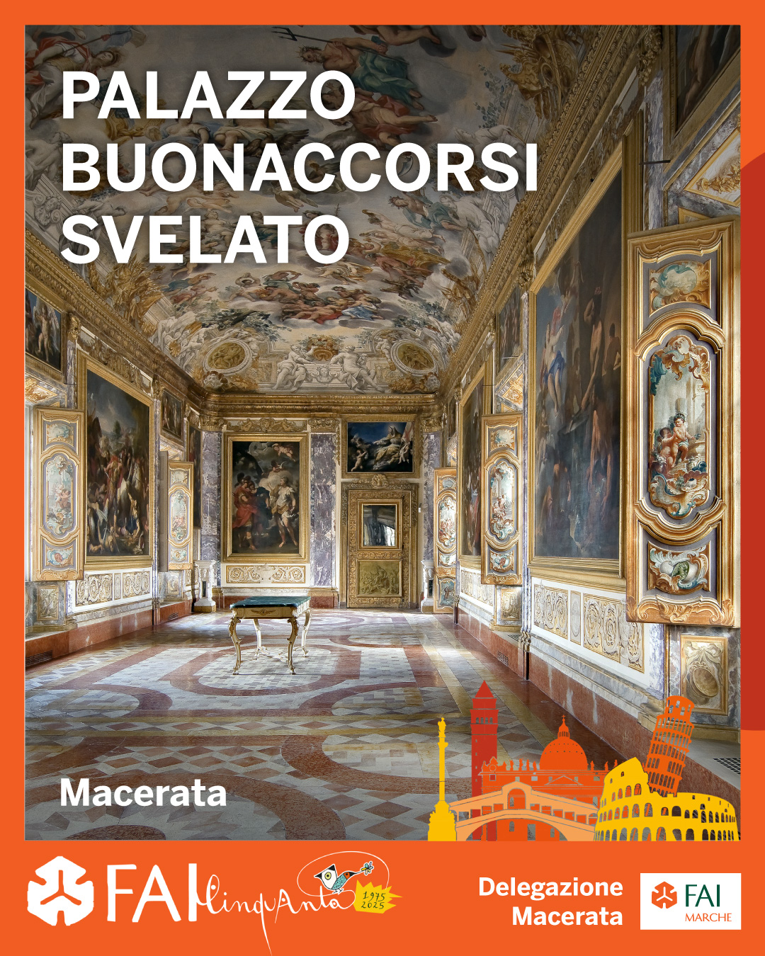 A Macerata, Musei Civici, Palazzo Buonaccorsi svelato: famiglia e affreschi ritrovati. Il palazzo è normalmente accessibile al pubblico, nelle Giornate FAI un percorso unico e inedito. Accompagnatori in abiti d’epoca che impersoneranno i membri della famiglia Buonaccorsi, racconti legati alla vita quotidiana e alla cucina del Settecento, aneddoti curiosi, rendendo il palazzo non solo un luogo di memoria artistica ma un ambiente vivo e abitato. Una narrazione immersiva, ammirando anche diversi affreschi appena restaurati..