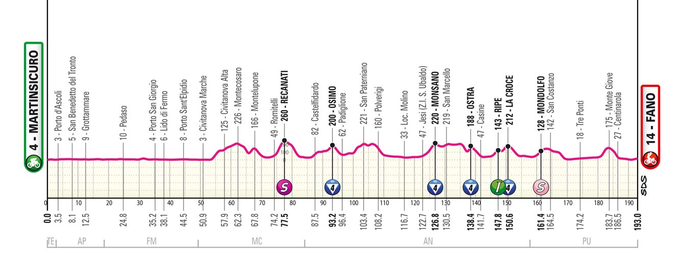 Dopo una prima parte lungo l’Adriatico, superata Civitanova Marche ci si allontana dal mare per affrontare un percorso fatto di continui saliscendi con strappi e strappetti più o meno difficili, se ne possono catalogare 10 (di cui 4 classificati GPM).