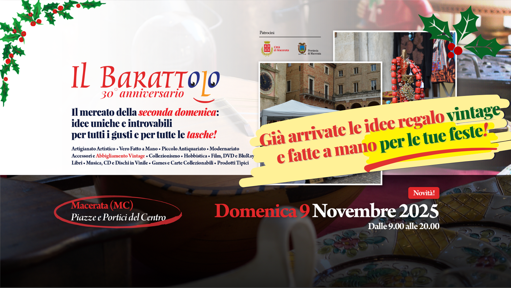 Questa edizione presenta caldissimo abbigliamento e accessori vintage, decorazioni realizzate a mano per la casa e per l’albero di Natale, presepi artigianali, prodotti del Vero Fatto a Mano, antiquariato e modernariato per la tua casa, collezionismo di ogni genere, libri, dischi, fumetti, musica e videogames, nonchè prodotti tipici enogastronomici.