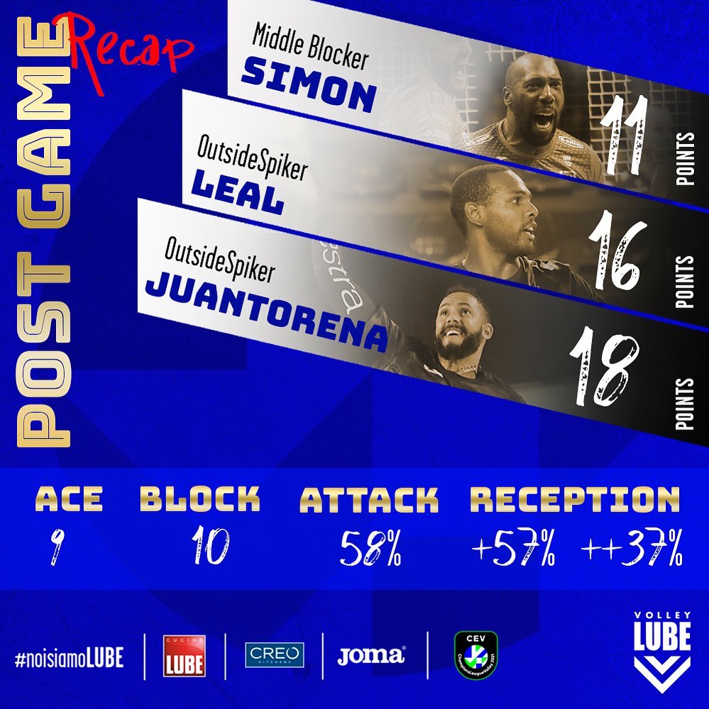 NOTE: Lube: bs 18, ace 9, muri 10, 57% in ricezione (37% perfette), 58% in attacco. Tours: bs 17, ace 2, muri 6, 33% in ricezione (19% perfette), 53% in attacco.