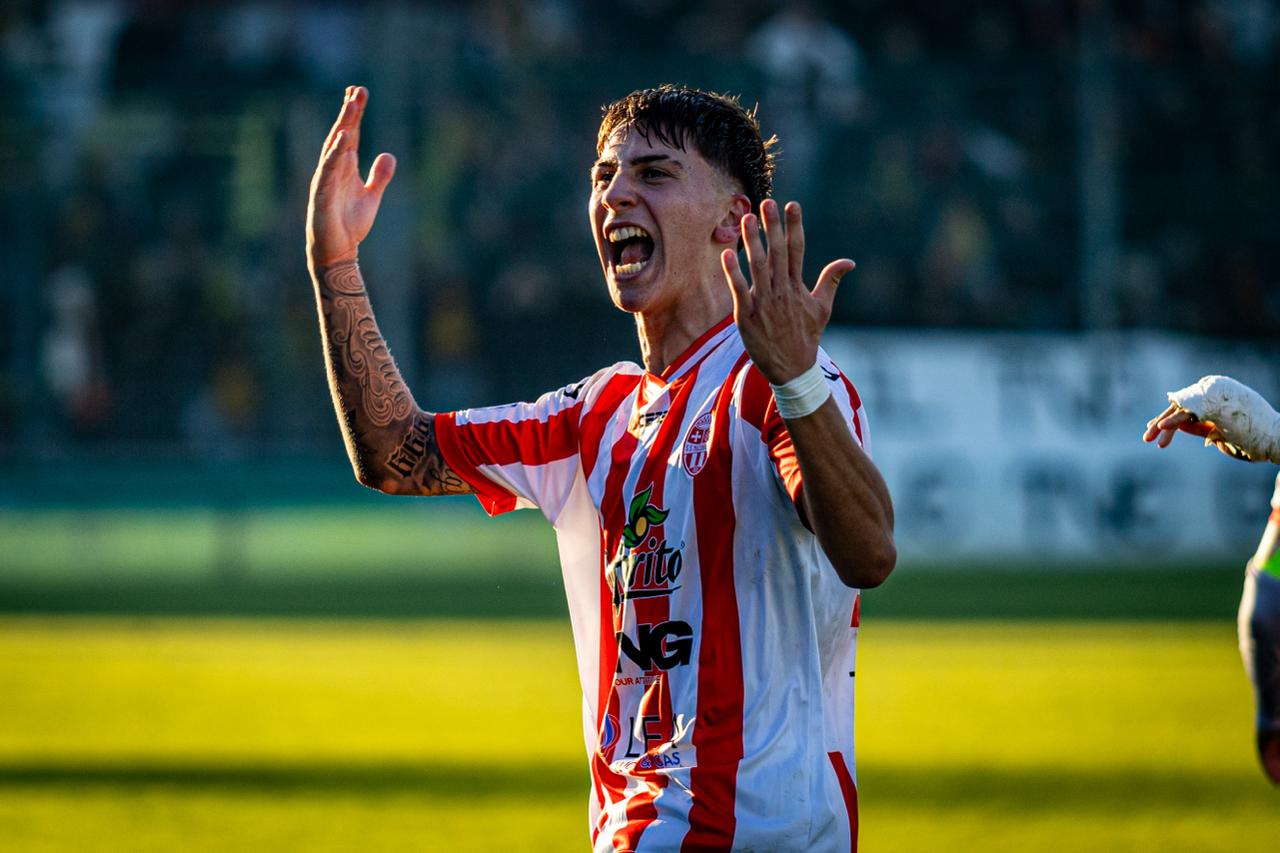 È il primo gol in Serie D, all’esordio da titolare, per il 17enne attaccante della Rata, che corre a esultare sotto il settore ospiti.
