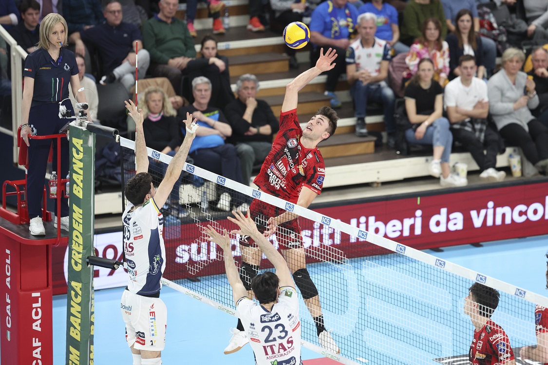 Nel terzo atto la Lube attacca con il 65% e Nikolov sigla “solo” 6 punti. Anche a muro è più efficiente la formazione cuciniera con 2 vincenti, ma la differenza, oltre al buon impatto di Bartha, la fanno i 4 ace trentini. Civitanova parte con l’ace di Nikolov (3-6). Trento si riavvicina grazie all’ace di Ramon, poi, nel giro di pochi scambi, ristabilisce l’equilibrio con il muro di Sbertoli (10-10) e trova il triplo vantaggio con 2 ace di Faure e un attacco di Lavia (13-10). La tenacia civitanovese viene premiata con la prodezza di Bottolo in attacco a l’ace di Boninfante (17-17). Come nel parziale precedente si arriva sul 23-23. Faure porta i gialloblù sul 24-23, ma Ramon non finalizza (24-24). Il servizio out della Lube e l’ace del nuovo entrato Gabi Garcia riaprono il match (26-24).