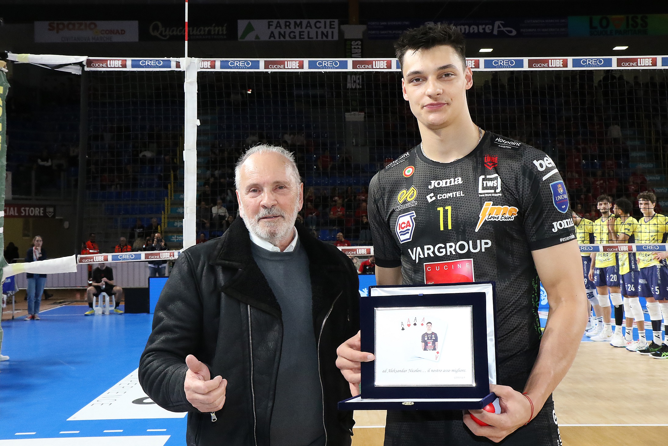 Apertura con cuoricini griffati Lube per tutti i tifosi e con la consegna di una targa ad Alex Nikolov da parte di Fabio Cardarelli di Geko, sponsor storico.