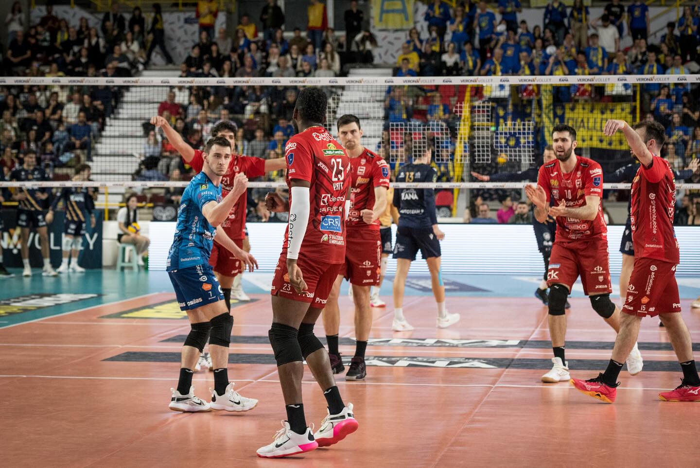 Verona disposta con Spirito al palleggio e Amin opposto, Grozdanov e Cortesia al centro, Keita e Dzavoronok di banda, l’ex biancorosso D’Amico libero.
