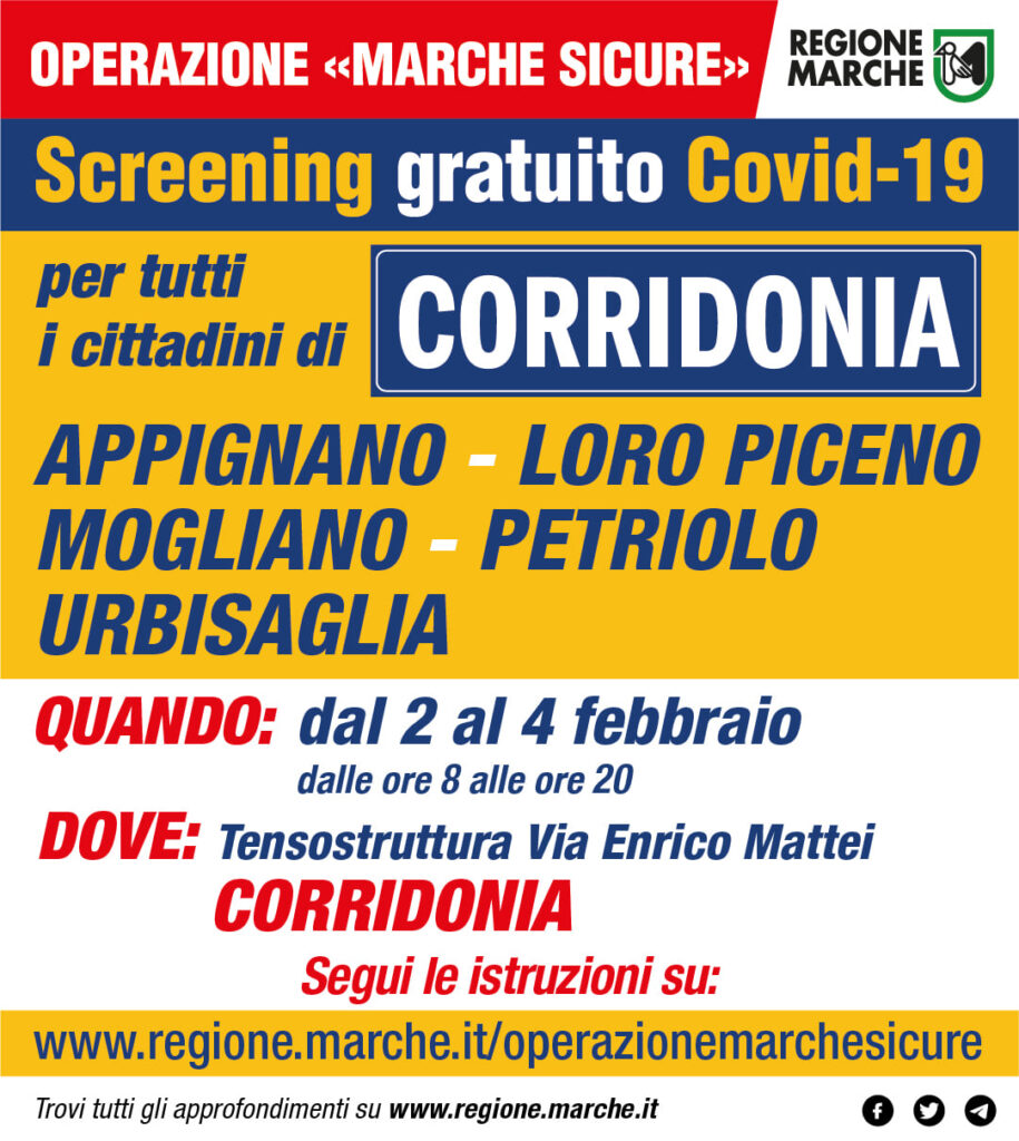 A Corridonia lo screening dell’operazione “Marche Sicure” si farà dal 2 al 4 febbraio dalle 8 alle 20 nella Tensostruttura in via Enrico Mattei. Potranno fare il tampone i cittadini dei Comuni di Corridonia, Appignano, Loro Piceno, Mogliano, Petriolo, Urbisaglia.