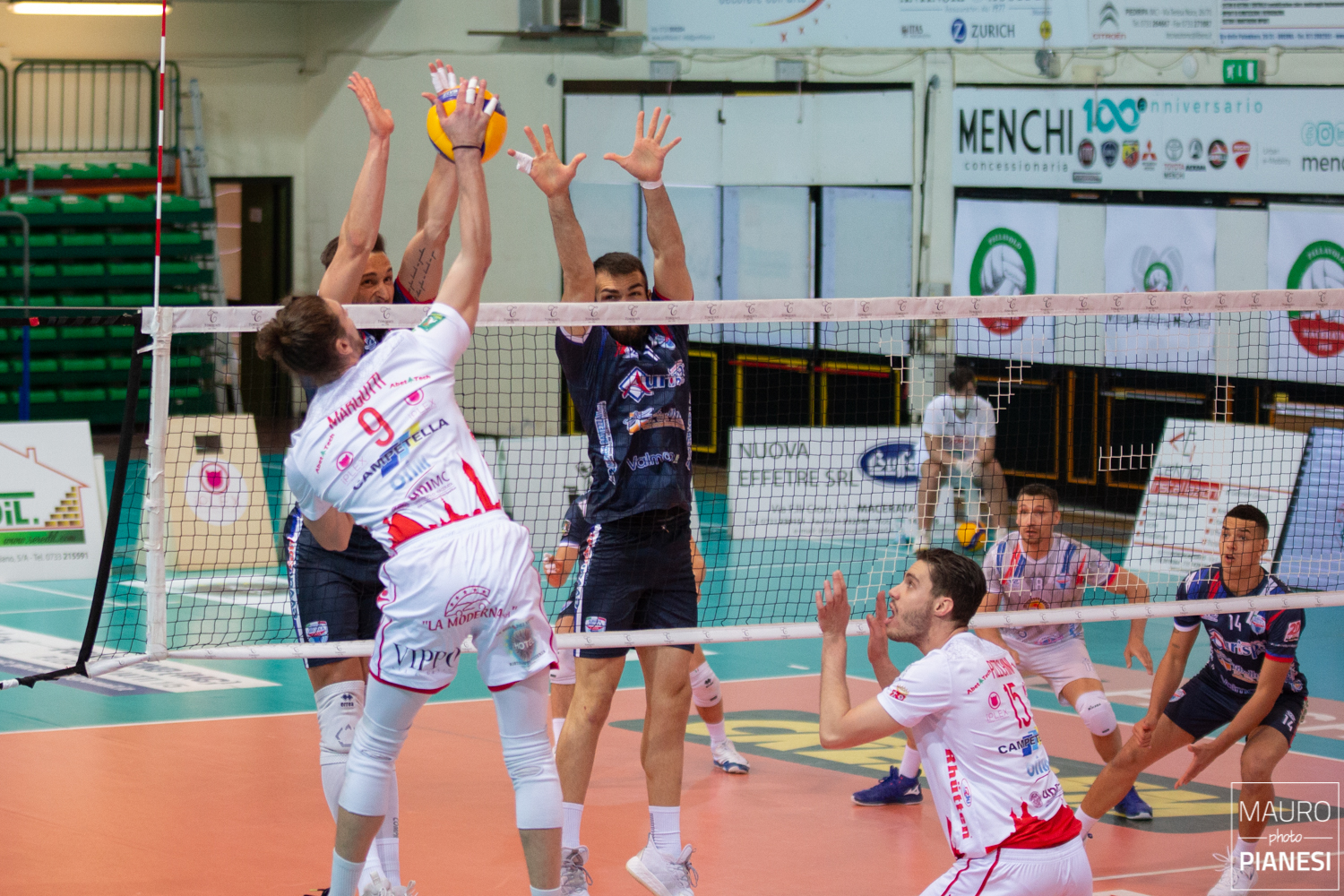 Nessun cambio per i due coach nei sestetti base. La Med Store scende in campo con Dennis, Margutti e Ferri, centrali Calonico e Pizzichini, Monopoli, Gabbanelli libero.