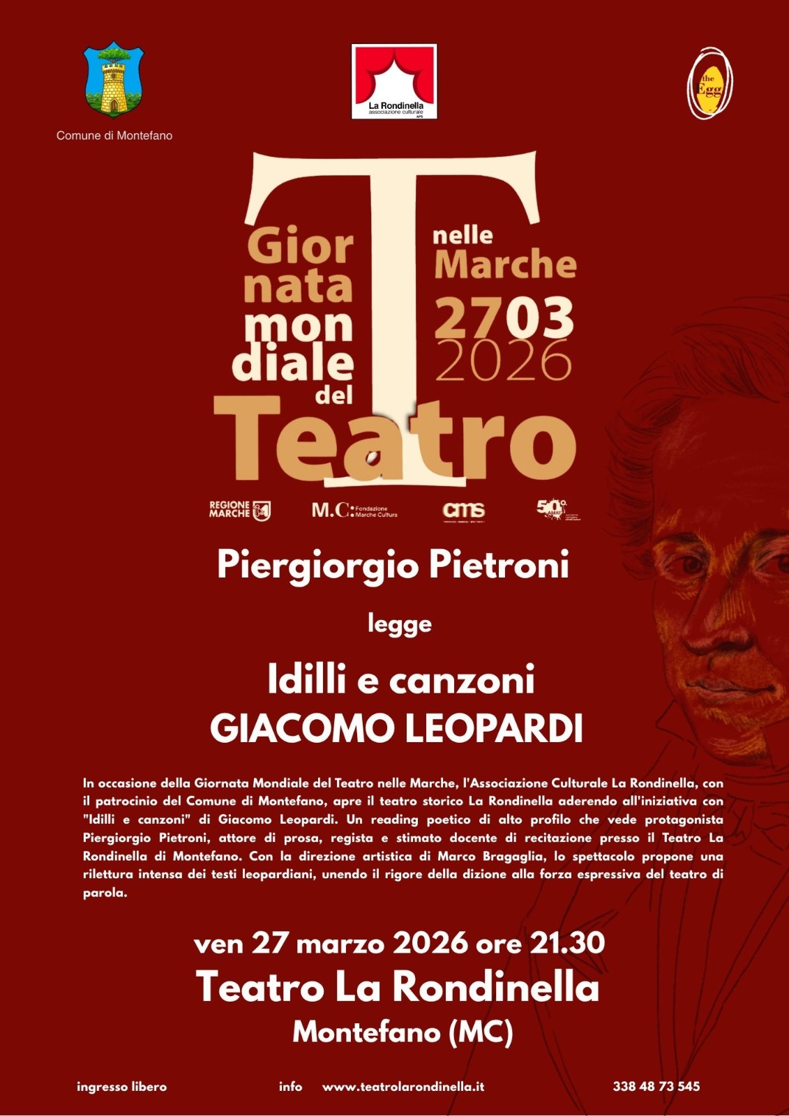 In occasione della Giornata Mondiale del Teatro nelle Marche, l’Associazione Culturale La Rondinella, con il patrocinio del Comune di Montefano, apre il teatro storico La Rondinella aderendo all’iniziativa con “Idilli e canzoni” di Giacomo Leopardi.