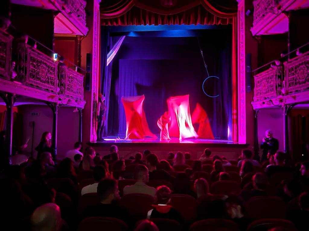 Lo spettacolo è iniziato al Teatro “La Rondinella”con l’apparizione di Mazzamurello, lo spiritello rumoroso, figura della tradizione folkloristica marchigiana, con l’intento di aprire il portale presente nel teatro per spalancare le porte dell’Altro/Dove (il paese delle storie e dei sogni) e far arrivare spiriti e spiritelli, mostri e vampiri nelle strade di Montefano.