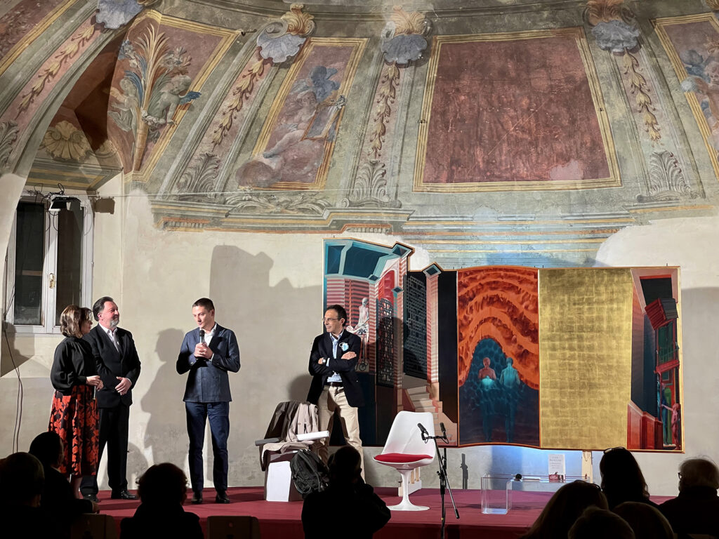 La pala “Trittico della teofania”, opera straordinaria, è stata allestita alle spalle di Vito Mancuso. Non ha mai trovato posto nella chiesa per cui era stata realizzata ed è rimasta per anni nello studio dell’artista. Rappresenta le annunciazioni delle nascite di Giovanni Battista (Lc 1,8-22) e Gesù (Lc 1,26-38) che fanno da cornice all’incontro tra i due durante il battesimo nel Giordano (Lc 3,21-22).