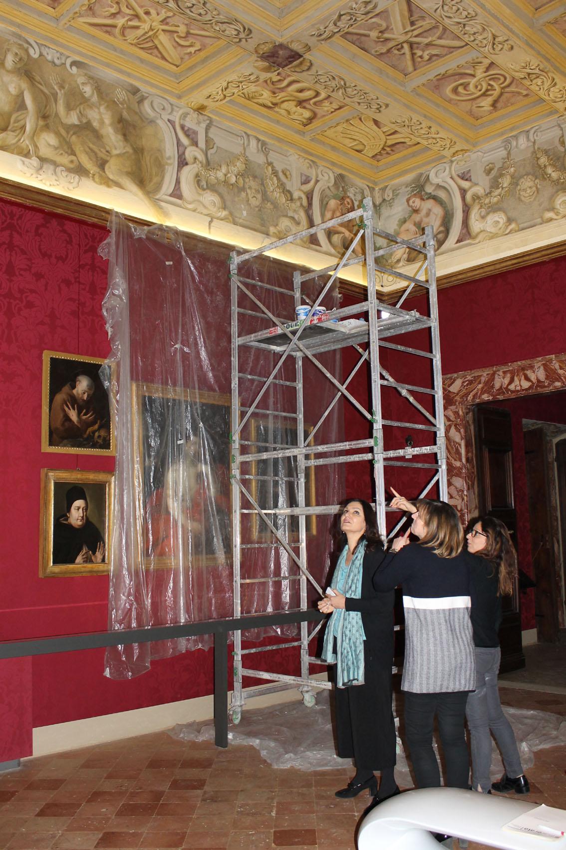 Nuovo sopralluogo stamattina, presente l’assessore alla cultura del comune di Macerata Stefania Monteverde, a Palazzo Buonaccorsi, dove fin dai primi giorni dopo il sisma le squadre di restauratori sono al lavoro per la messa in sicurezza degli intonaci decorati delle sale del piano nobile che ospitano la collezione di arte antica dei musei civici.