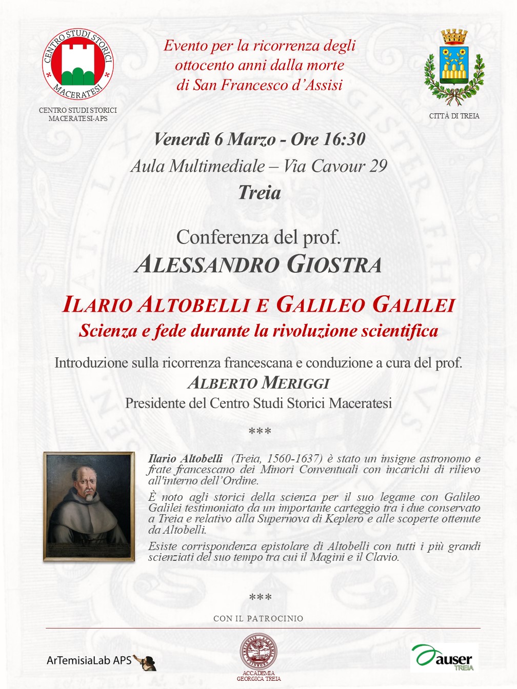 Venerdì 6 marzo, ore 16.30 nell’Aula Multimediale di Treia (via Cavour 29), il Centro Studi Storici Maceratesi organizza una conferenza tenuta dal prof. Alessandro Giostra su “Ilario Altobelli e Galileo Galilei. Scienza e fede durante la rivoluzione scientifica”.