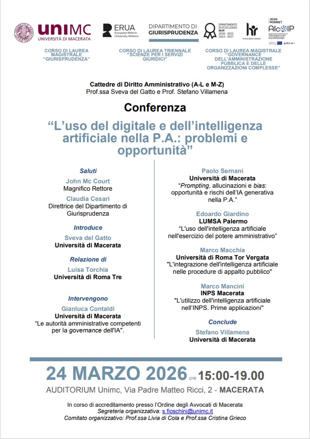 Martedì 24 marzo, ore 15 nell’Auditorium dell’Università di Macerata, si terrà la conferenza “L’uso del digitale e dell’intelligenza artificiale nella P.A.: problemi e opportunità”.